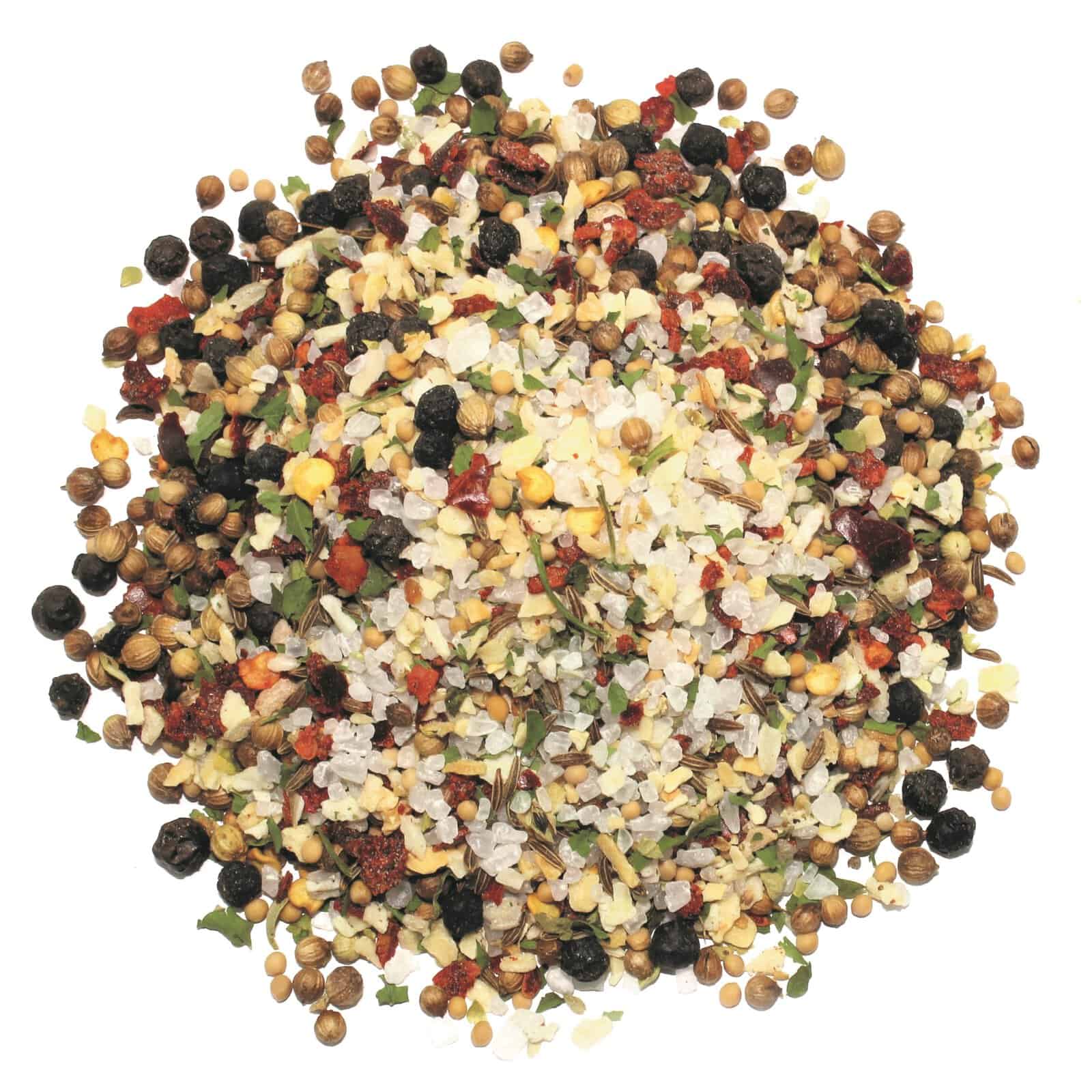 | Zutaten | Meersalz (50%), Pfeffer, Senf, Knoblauch, Chili, Koriander, Zwiebeln, Kümmel, Oregano, Petersilie. |