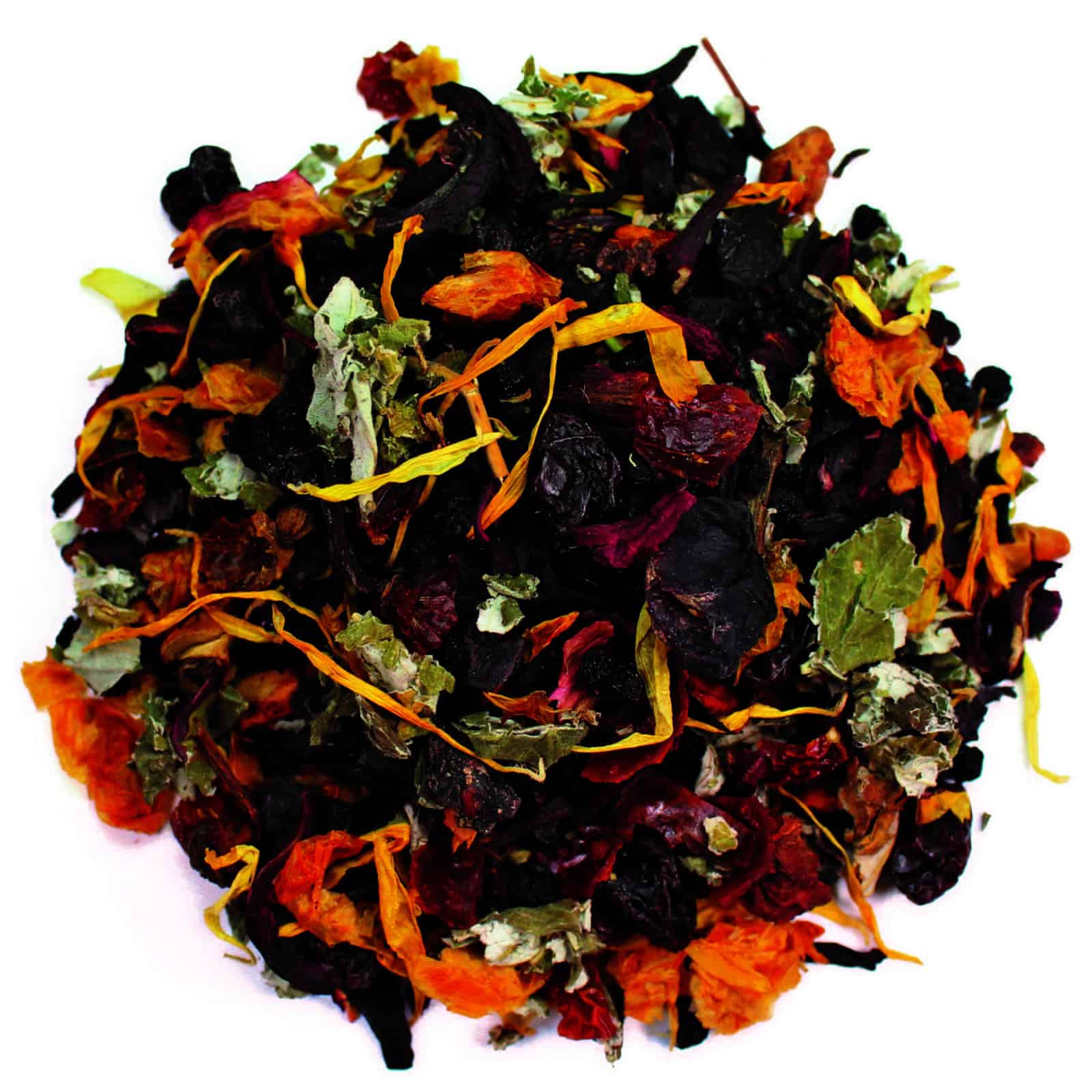 Zutaten: Holunderbeeren, Weinbeeren, Hibiskus, Hagebutten, Apfelstücke, Sanddornbeeren (4%), Aroniabeeren, Himbeerblätter, Ringelblumenblüten, natürliches Aroma